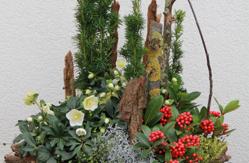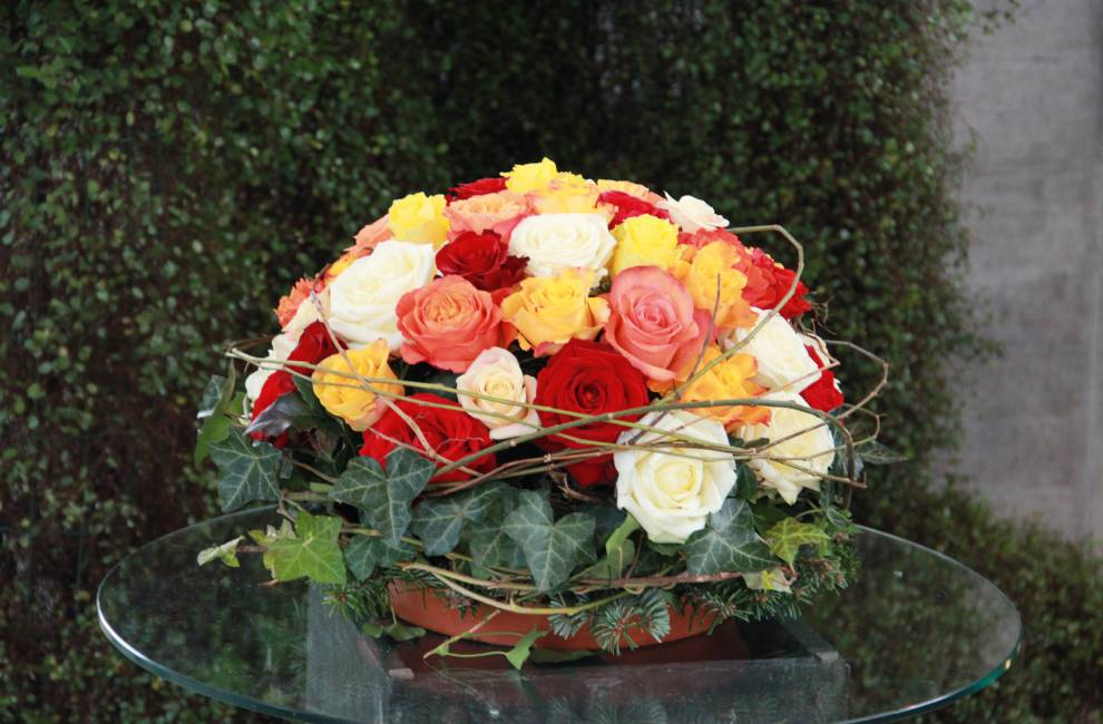 Gestecke in paralleler, aufrechter oder runder Form. Dekorative Schalen mit saisonalen Pflanzen, Pflanzring, Herz-, Kreuz-, Kissen-Bindereien in Symbolformen.
