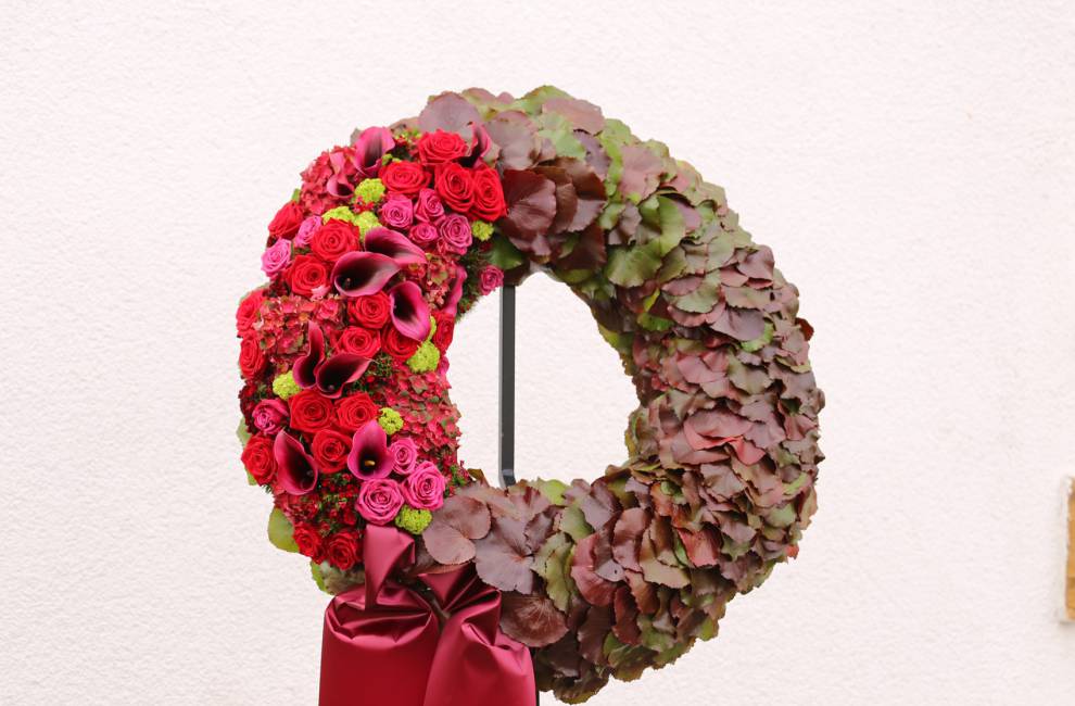 Kränze in unterschiedlichen Gestaltungsarten – abfließende Garnierung, vegetativer Kranz, grüne Kranzform mit individuellem Blumenschmuck, Kranzschmuck in Tropfen- oder Herzform, rundgesteckter Blütenkranz, Streifenkranz ...